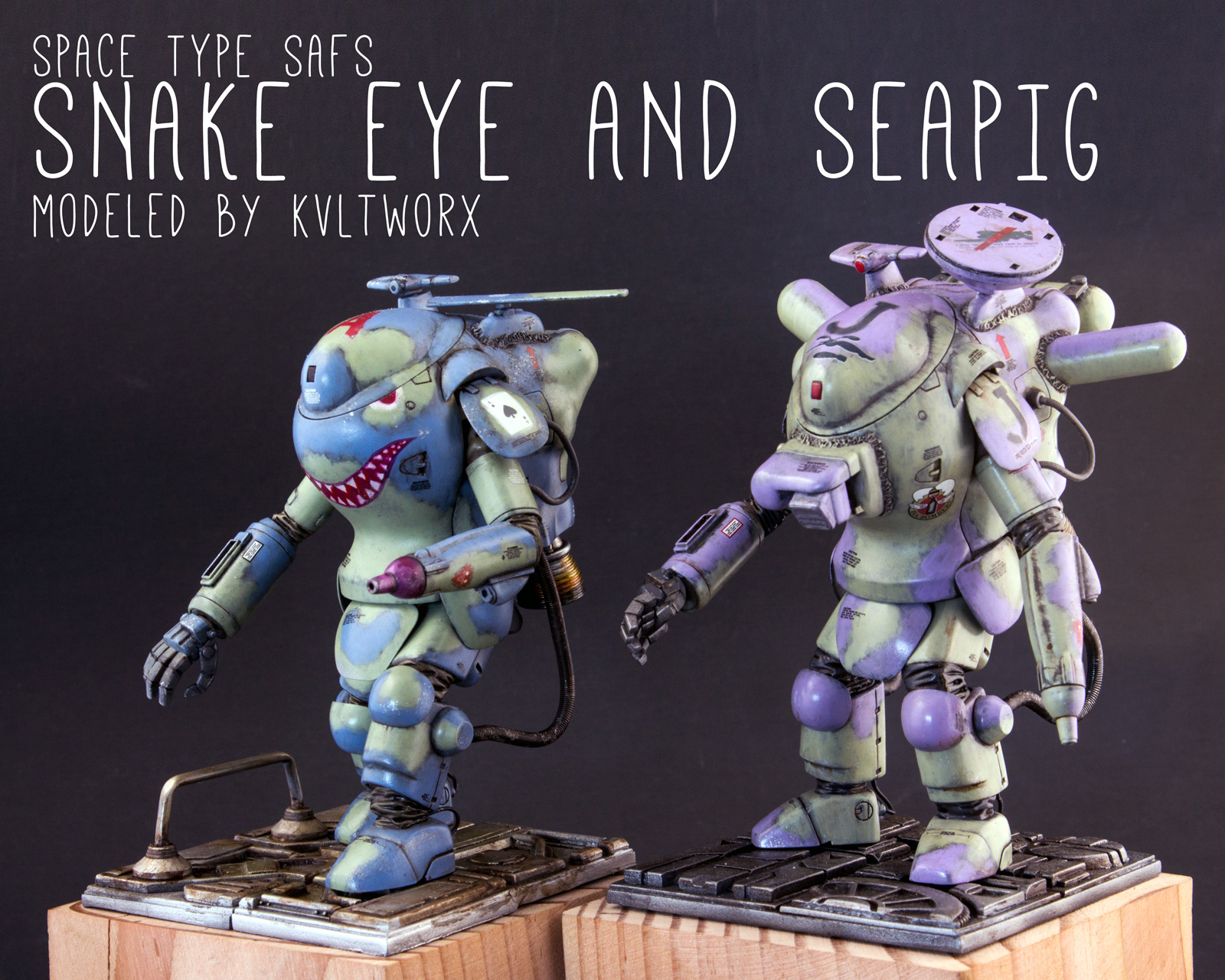 The first hiccup was during construction, somehow I managed to break both the hatch hinges on each kit (on the Seapig even after painting the pilot already) - thus forcing me to build them with the hatches glued shut. At the time, being fairly new to redoing the joints via epoxy sculpt, they were made a little too "lanky" and the kits both look slightly taller than usual when placed next to another SAFS kit with original joint.